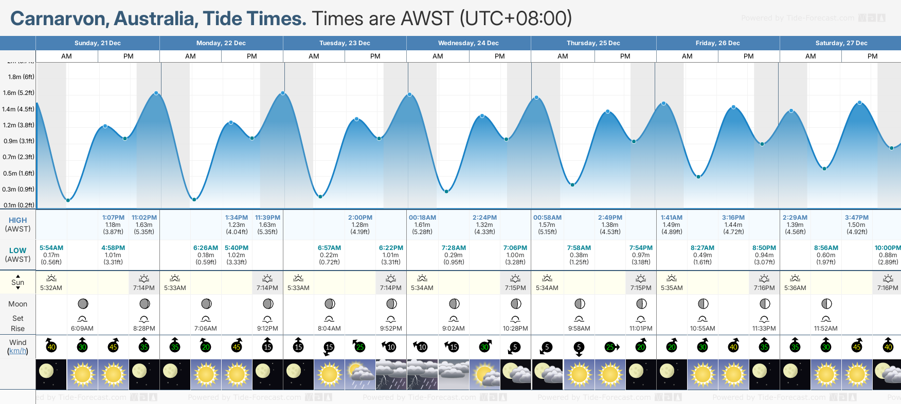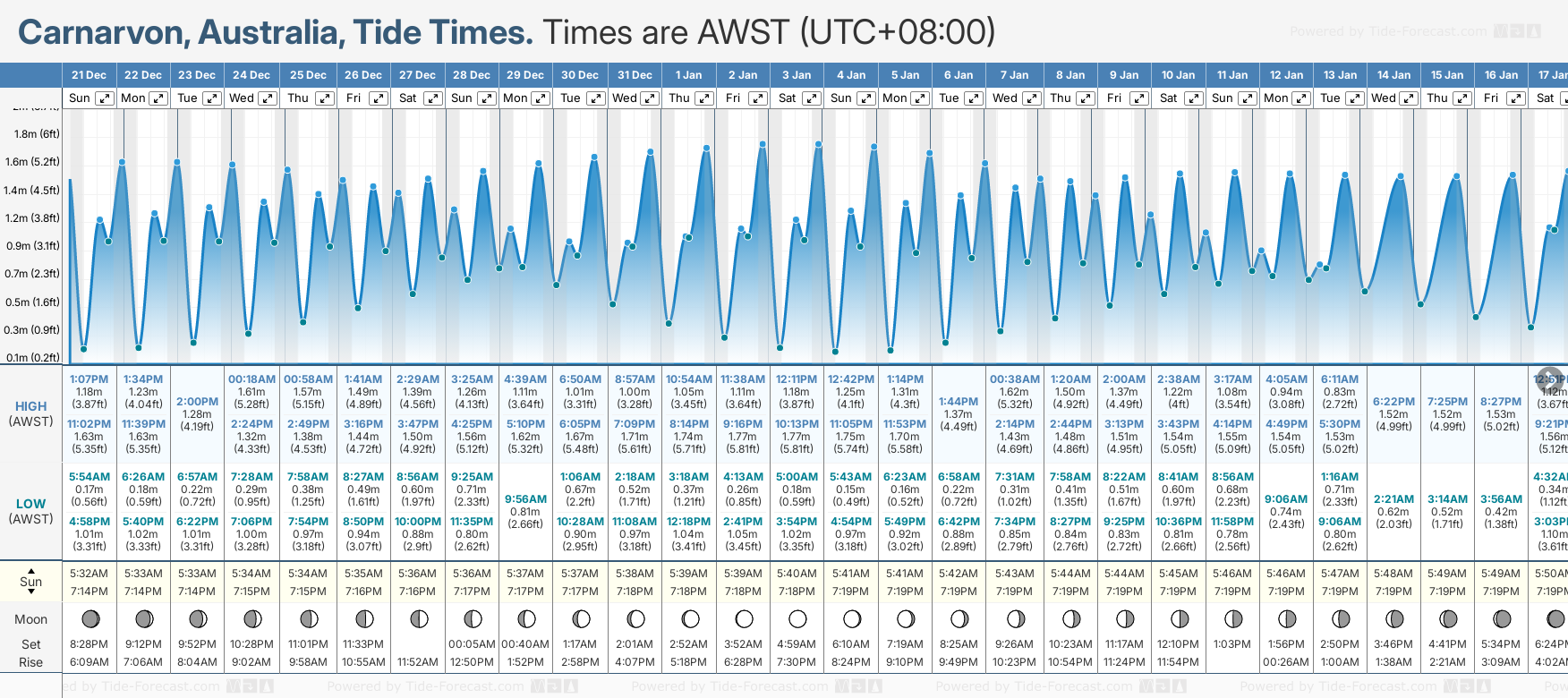 Tide chart for CarnarvonShowing low and high tide times for the next 30 days at Carnarvon. Tide Times are AWST (UTC +8.0hrs).
