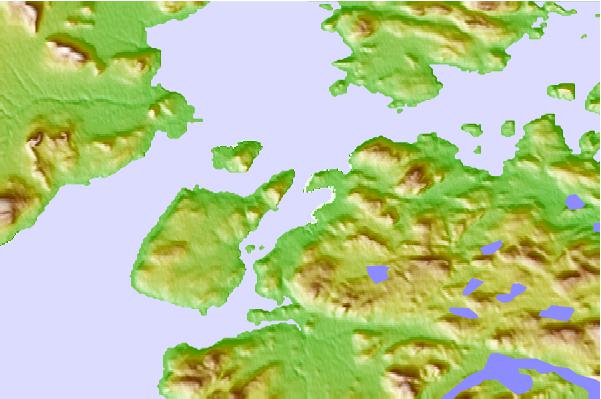 Use this relief map to navigate to tide stations, surf breaks and cities that are in the area of Cartwright Harbour, Newfoundland.
