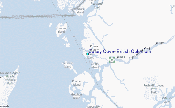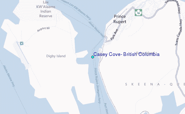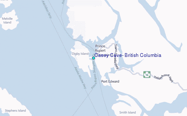 Use this relief map to navigate to tide stations, surf breaks and cities that are in the area of Casey Cove, British Columbia.