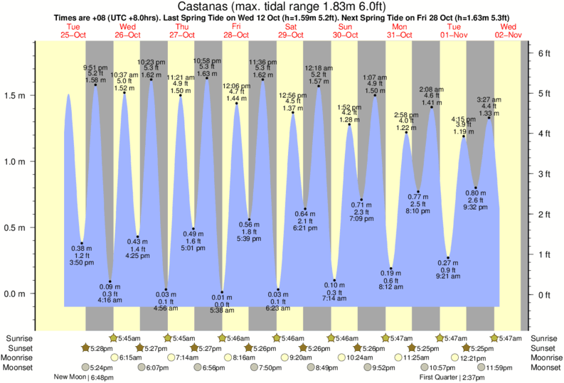 Tide Times are PST (UTC +8.0hrs). Last Spring High Tide at Castanas was on Sun 07 Dec (height: 1.69m 5.5ft). Next high Spring Tide at Castanas will be on Tue 23 Dec (height: 1.56m 5.1ft).