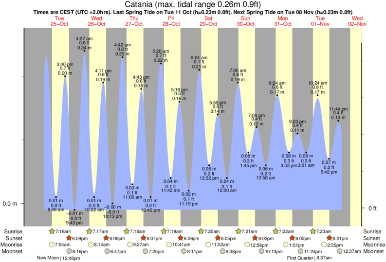 Tide Times are CET (UTC +1.0hrs). Last Spring High Tide at Catania was on Fri 19 Dec (height: 0.22m 0.7ft). Next high Spring Tide at Catania will be on Fri 02 Jan (height: 0.24m 0.8ft).