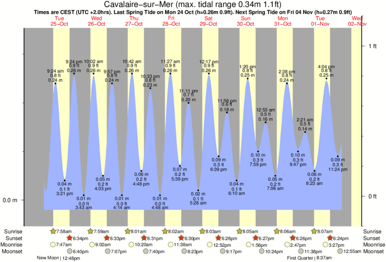 Tide chart for Cavalaire-sur-MerShowing low and high tide times for the next 30 days at Cavalaire-sur-Mer. Tide Times are CET (UTC +1.0hrs).