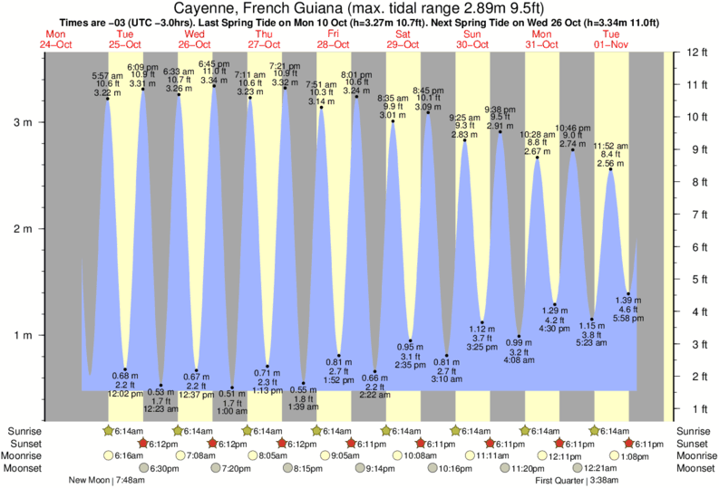 Tide chart for CayenneShowing low and high tide times for the next 30 days at Cayenne. Tide Times are -03 (UTC -3.0hrs).
