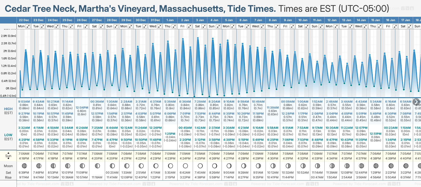 Tide chart for Cedar Tree Neck, Martha's VineyardShowing low and high tide times for the next 30 days at Cedar Tree Neck, Martha's Vineyard. Tide Times are EST (UTC -5.0hrs).