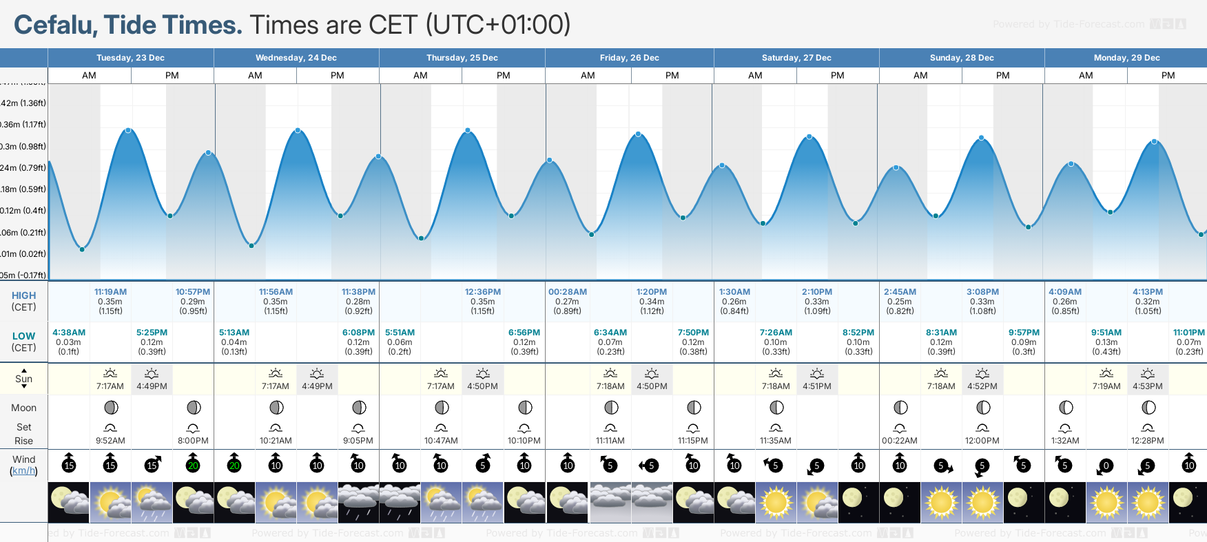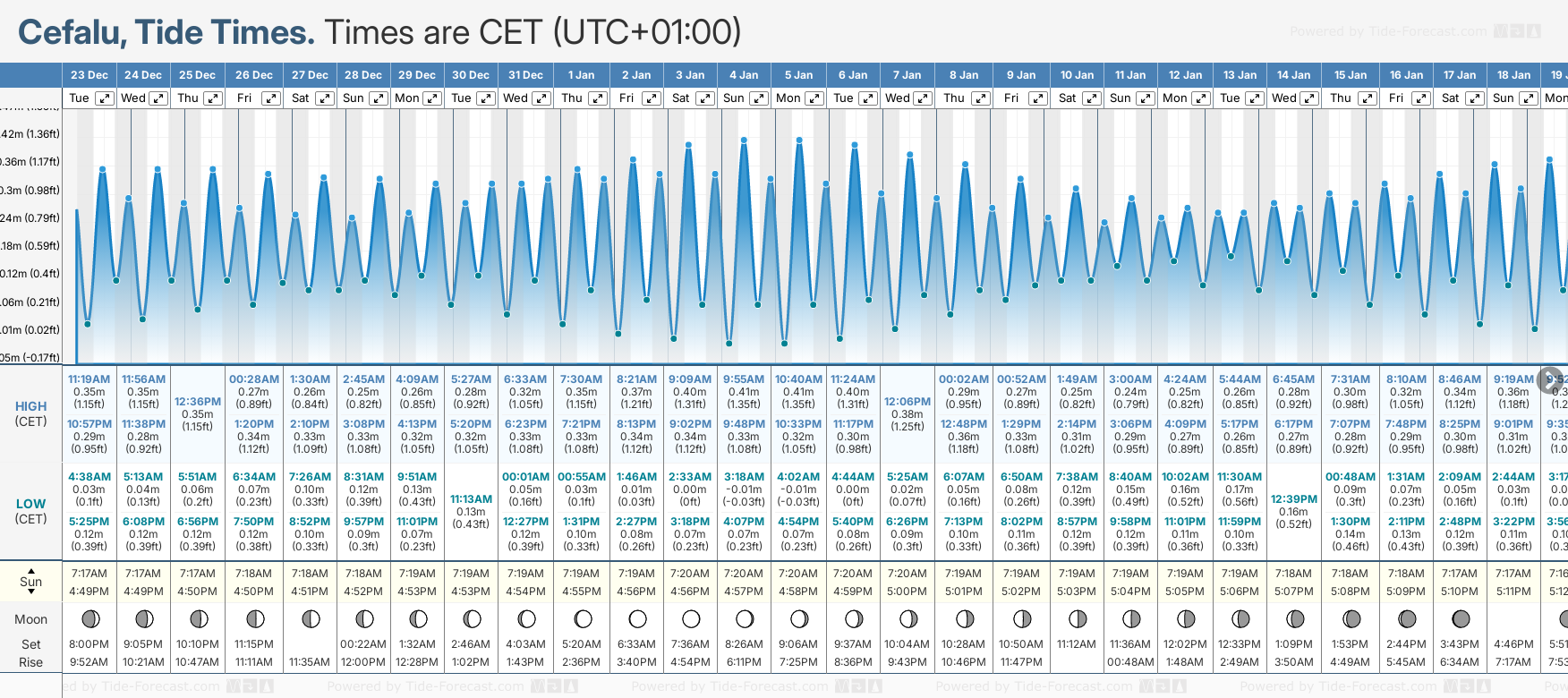 December and January Tide charts for Cefalu: The tide charts below show the height, time and date of high and low tides for the next 30 days.
