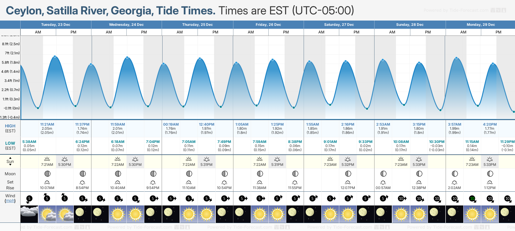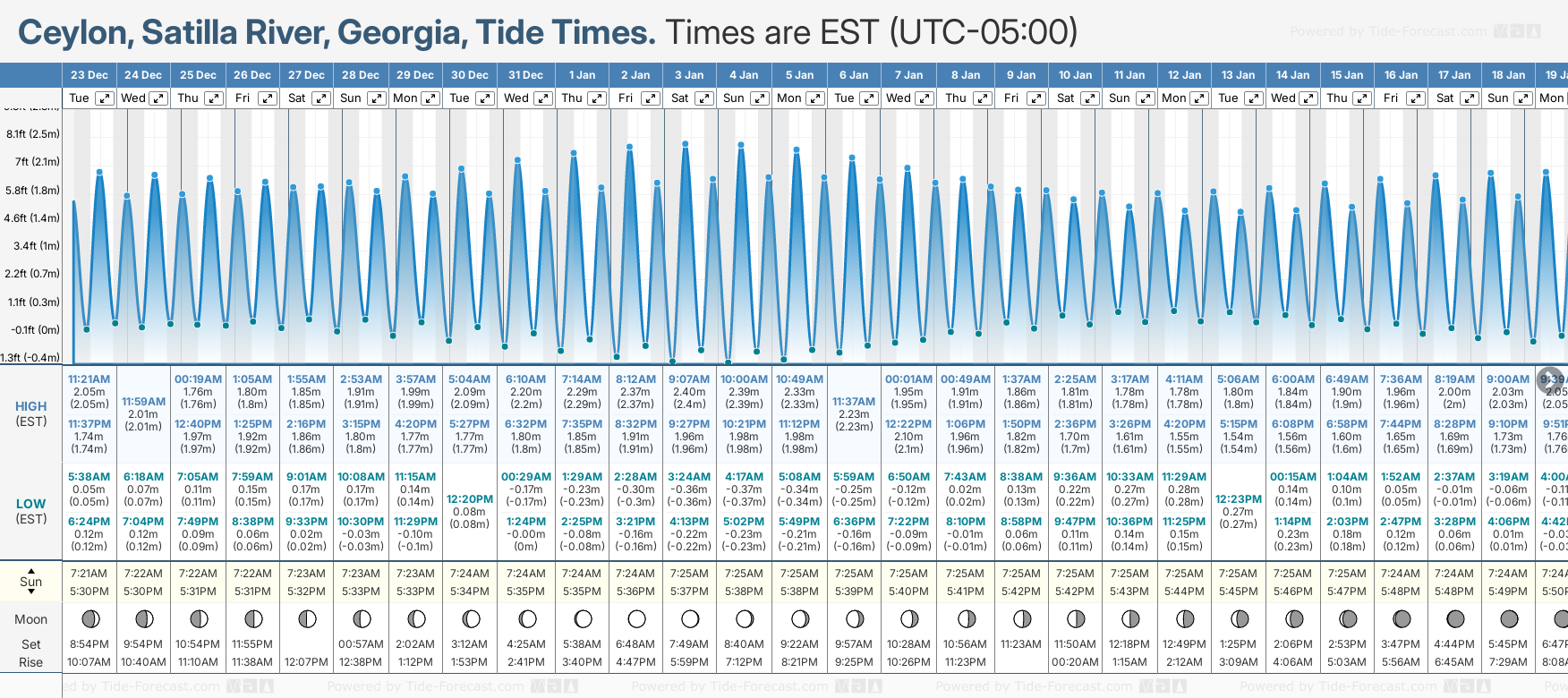 December and January Tide charts for Ceylon, Satilla River: The tide charts below show the height, time and date of high and low tides for the next 30 days.
