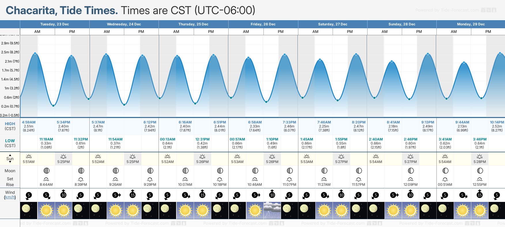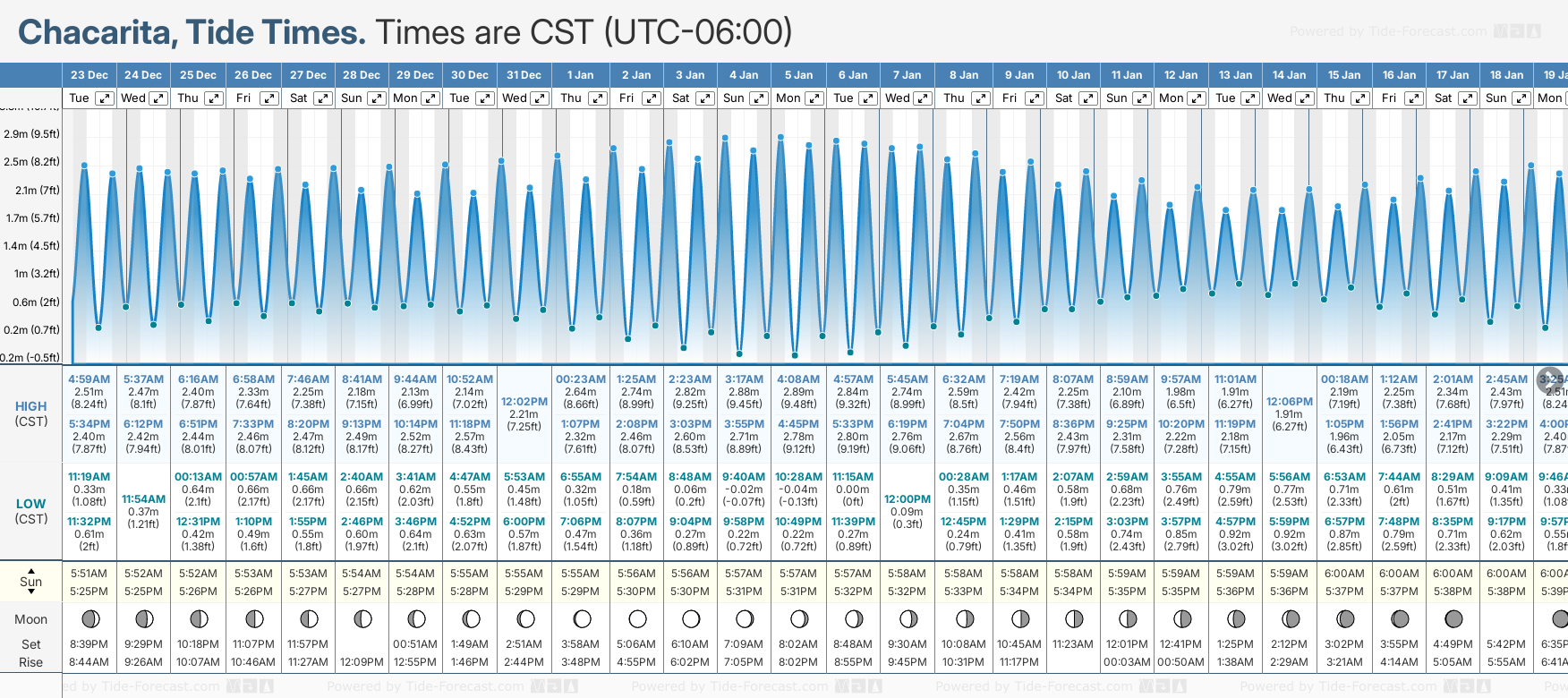 Tide chart for ChacaritaShowing low and high tide times for the next 30 days at Chacarita. Tide Times are CST (UTC -6.0hrs).
