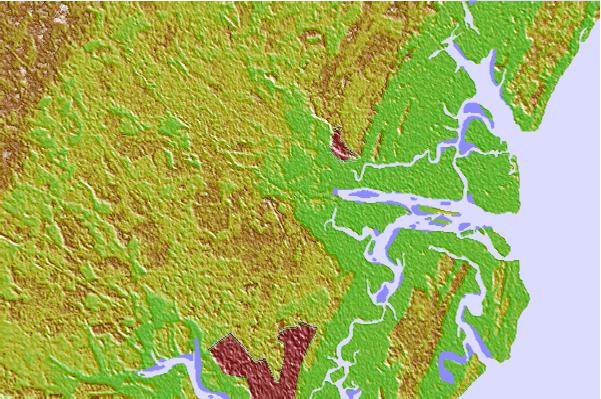Use this relief map to navigate to tide stations, surf breaks and cities that are in the area of Champney Island, South Altamaha River, Georgia.