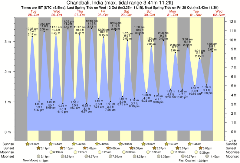 Tide Times are IST (UTC +5.5hrs). Last Spring High Tide at Chandbali was on Sat 06 Dec (height: 3.14m 10.3ft). Next high Spring Tide at Chandbali will be on Mon 22 Dec (height: 2.73m 9.0ft).