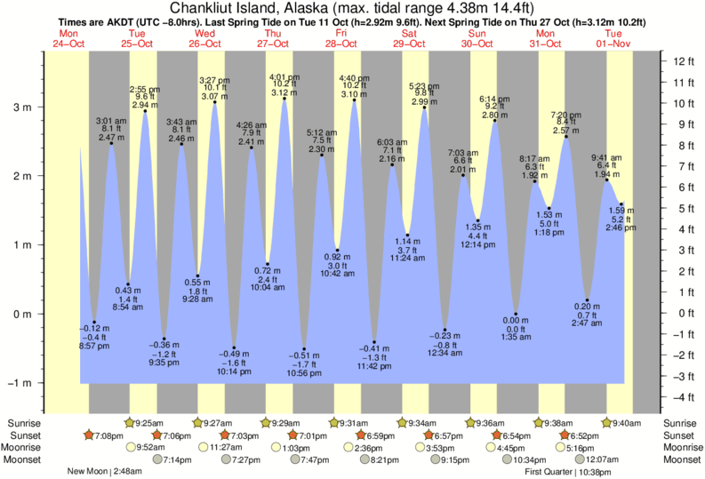 Tide Times are AKST (UTC -9.0hrs). Last Spring High Tide at Chankliut Island was on Fri 05 Dec (height: 3.44m 11.3ft). Next high Spring Tide at Chankliut Island will be on Sat 20 Dec (height: 2.89m 9.5ft).