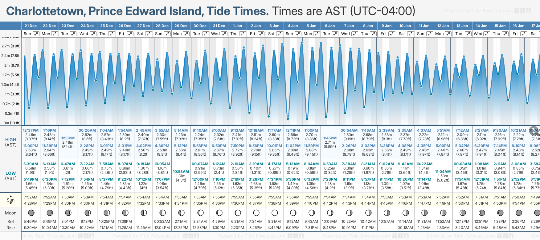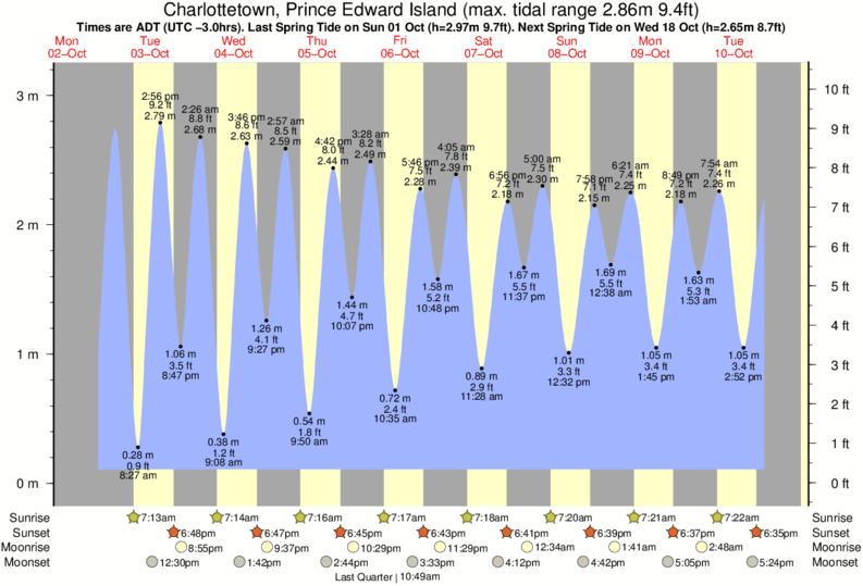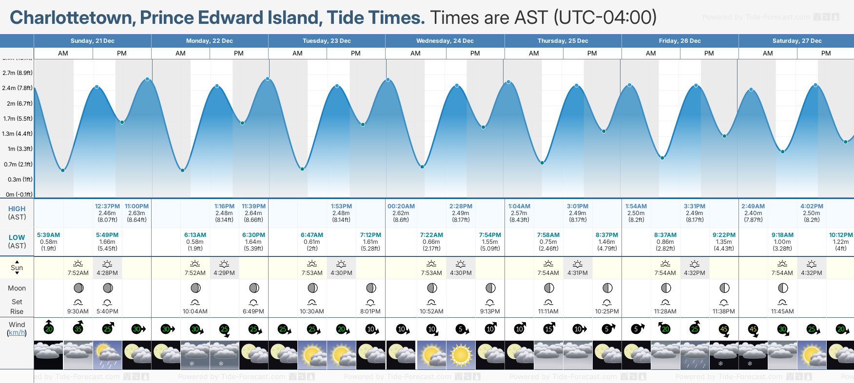 Tide chart for CharlottetownShowing low and high tide times for the next 30 days at Charlottetown. Tide Times are AST (UTC -4.0hrs).