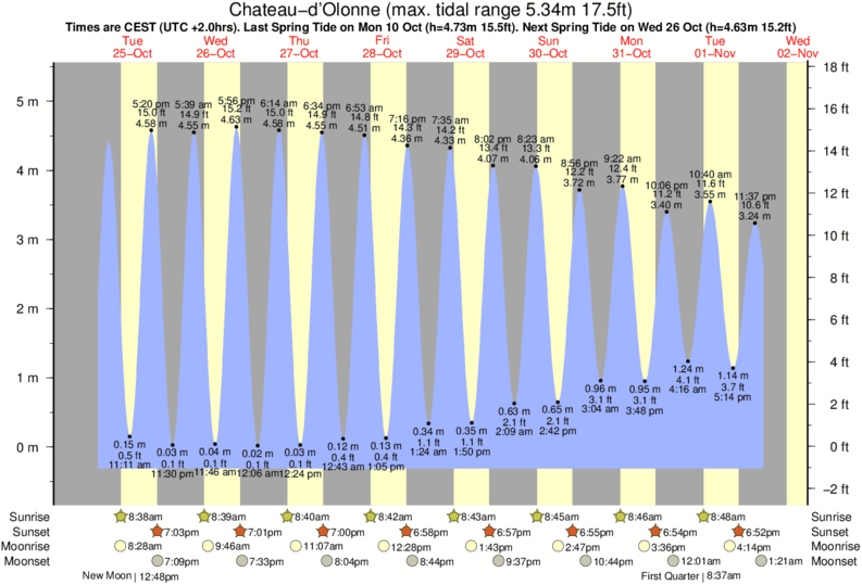 Tide Times are CET (UTC +1.0hrs). Last Spring High Tide at Chateau-d'Olonne was on Sat 06 Dec (height: 4.55m 14.9ft). Next high Spring Tide at Chateau-d'Olonne will be on Mon 22 Dec (height: 3.99m 13.1ft).