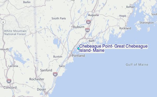Use this relief map to navigate to tide stations, surf breaks and cities that are in the area of Chebeague Point, Great Chebeague Island, Maine.