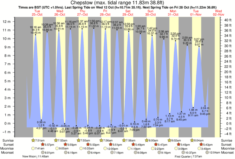 Tide Times are GMT (UTC +0hrs). Last Spring High Tide at Chepstow was on Sat 06 Dec (height: 11.51m 37.8ft). Next high Spring Tide at Chepstow will be on Wed 24 Dec (height: 10.57m 34.7ft).