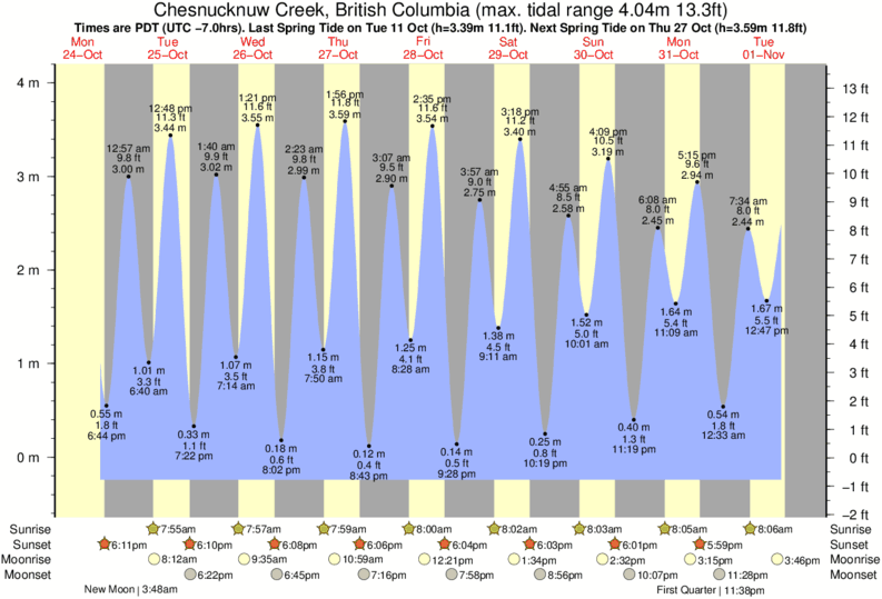 Chesnucknuw Creek tide chart key: The tide chart above shows the height and times of high tide and low tide for Chesnucknuw Creek, British Columbia. The grey shading corresponds to nighttime hours between sunset and sunrise at Chesnucknuw Creek.