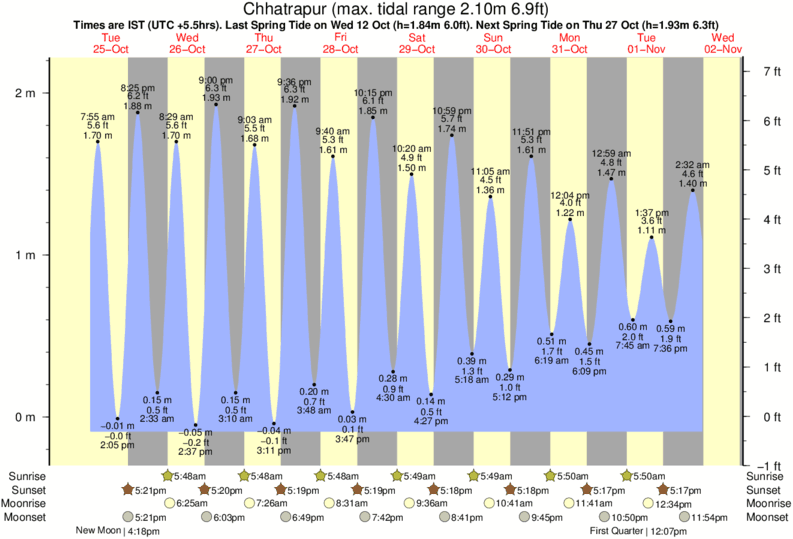 Tide Times are IST (UTC +5.5hrs). Last Spring High Tide at Chhatrapur was on Sat 06 Dec (height: 1.98m 6.5ft). Next high Spring Tide at Chhatrapur will be on Mon 22 Dec (height: 1.75m 5.7ft).