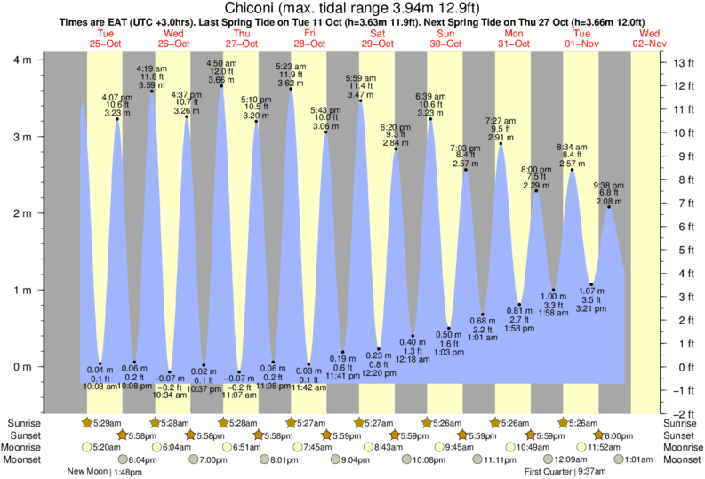 Tide Times are EAT (UTC +3.0hrs). Last Spring High Tide at Chiconi was on Sat 06 Dec (height: 3.66m 12.0ft). Next high Spring Tide at Chiconi will be on Mon 22 Dec (height: 3.21m 10.5ft).
