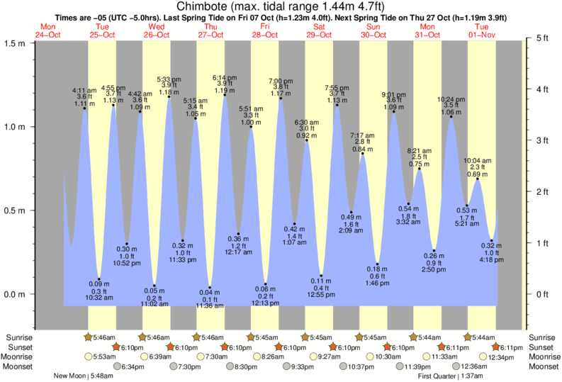 Tide Times are -05 (UTC -5.0hrs). Last Spring High Tide at Chimbote was on Fri 05 Dec (height: 1.32m 4.3ft). Next high Spring Tide at Chimbote will be on Mon 22 Dec (height: 1.12m 3.7ft).