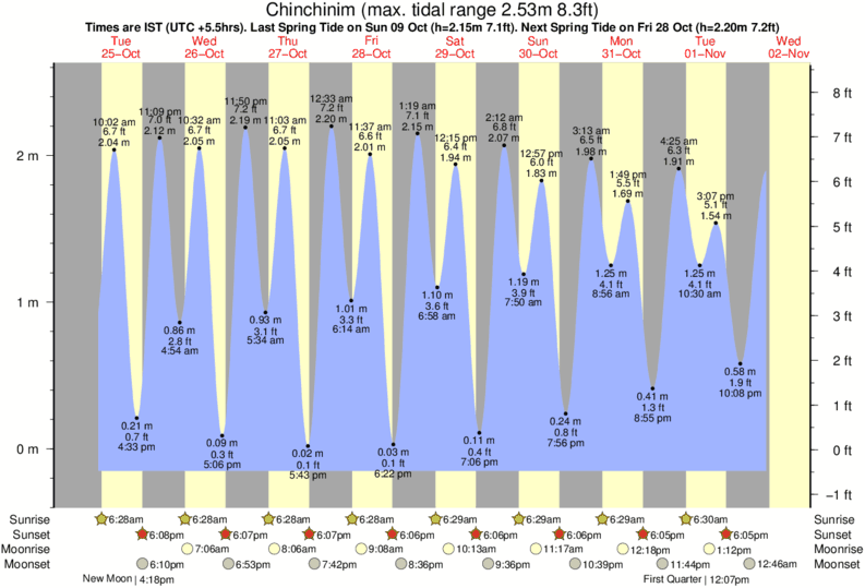 Tide Times are IST (UTC +5.5hrs). Last Spring High Tide at Chinchinim was on Sat 06 Dec (height: 2.33m 7.6ft). Next high Spring Tide at Chinchinim will be on Tue 23 Dec (height: 2.10m 6.9ft).