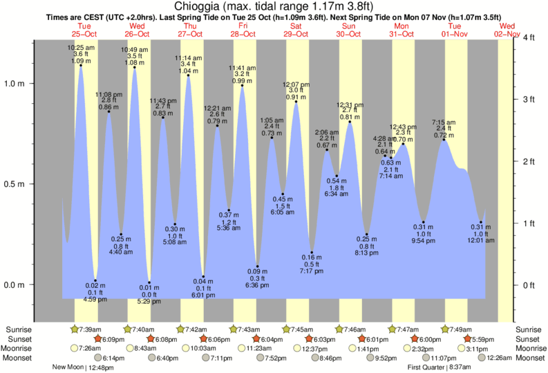 Tide chart for ChioggiaShowing low and high tide times for the next 30 days at Chioggia. Tide Times are CET (UTC +1.0hrs).