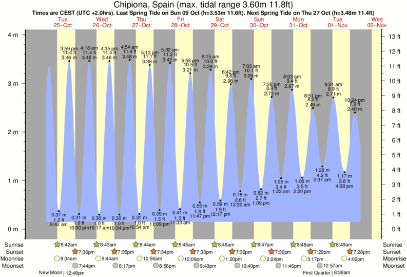 Tide Times are CET (UTC +1.0hrs). Last Spring High Tide at Chipiona was on Sat 06 Dec (height: 3.55m 11.6ft). Next high Spring Tide at Chipiona will be on Mon 22 Dec (height: 3.19m 10.5ft).