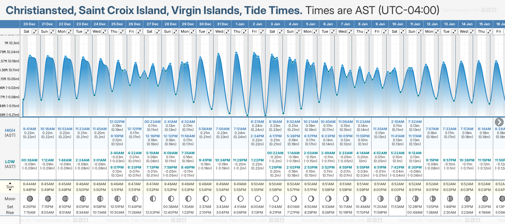 December and January Tide charts for Christiansted, Saint Croix Island: The tide charts below show the height, time and date of high and low tides for the next 30 days.