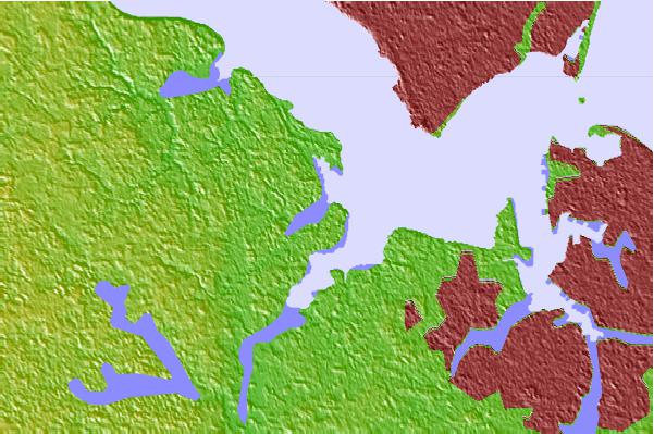 Use this relief map to navigate to tide stations, surf breaks and cities that are in the area of Chuckatuck Creek entrance, James River, Virginia.