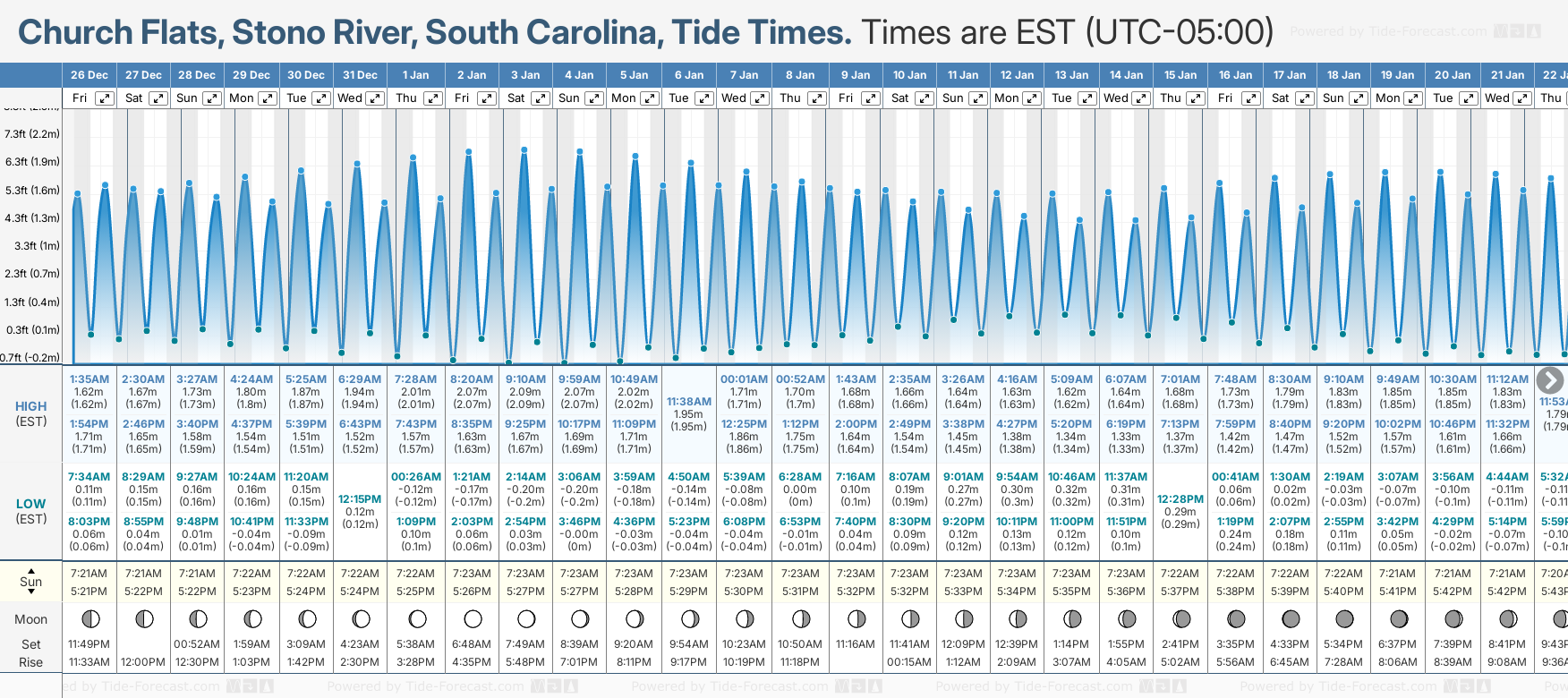 December and January Tide charts for Church Flats, Stono River: The tide charts below show the height, time and date of high and low tides for the next 30 days.