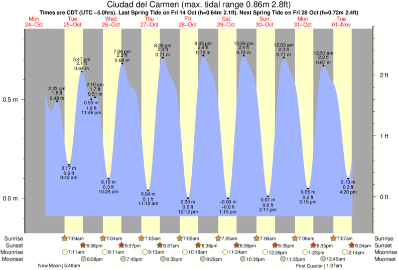 Tide Times are CST (UTC -6.0hrs). Last Spring High Tide at Ciudad del Carmen was on Fri 19 Dec (height: 0.69m 2.3ft). Next high Spring Tide at Ciudad del Carmen will be on Fri 02 Jan (height: 0.76m 2.5ft).