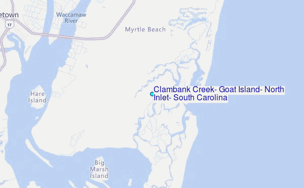 Use this relief map to navigate to tide stations, surf breaks and cities that are in the area of Clambank Creek, Goat Island, North Inlet, South Carolina.