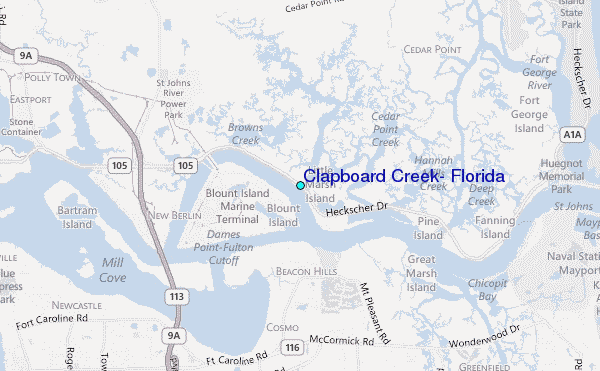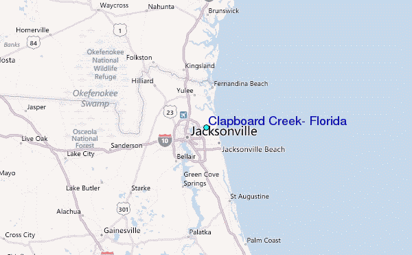 Use this relief map to navigate to tide stations, surf breaks and cities that are in the area of Clapboard Creek, Florida.
