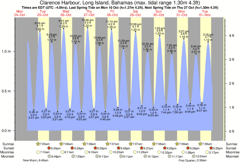 Tide Times are EST (UTC -5.0hrs). Last Spring High Tide at Clarence Harbour, Long Island was on Fri 05 Dec (height: 1.26m 4.1ft). Next high Spring Tide at Clarence Harbour, Long Island will be on Sun 21 Dec (height: 1.06m 3.5ft).
