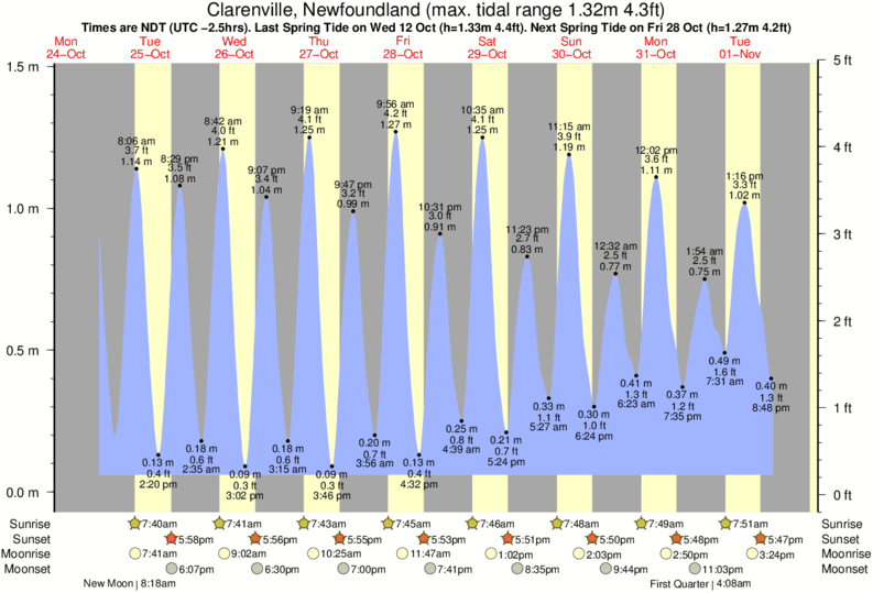 Clarenville tide chart key: The tide chart above shows the height and times of high tide and low tide for Clarenville, Newfoundland. The grey shading corresponds to nighttime hours between sunset and sunrise at Clarenville.