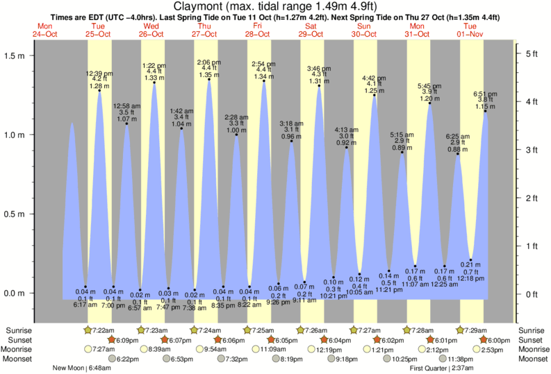 Tide Times are EST (UTC -5.0hrs). Last Spring High Tide at Claymont was on Fri 05 Dec (height: 1.46m 4.8ft). Next high Spring Tide at Claymont will be on Sat 20 Dec (height: 1.22m 4.0ft).