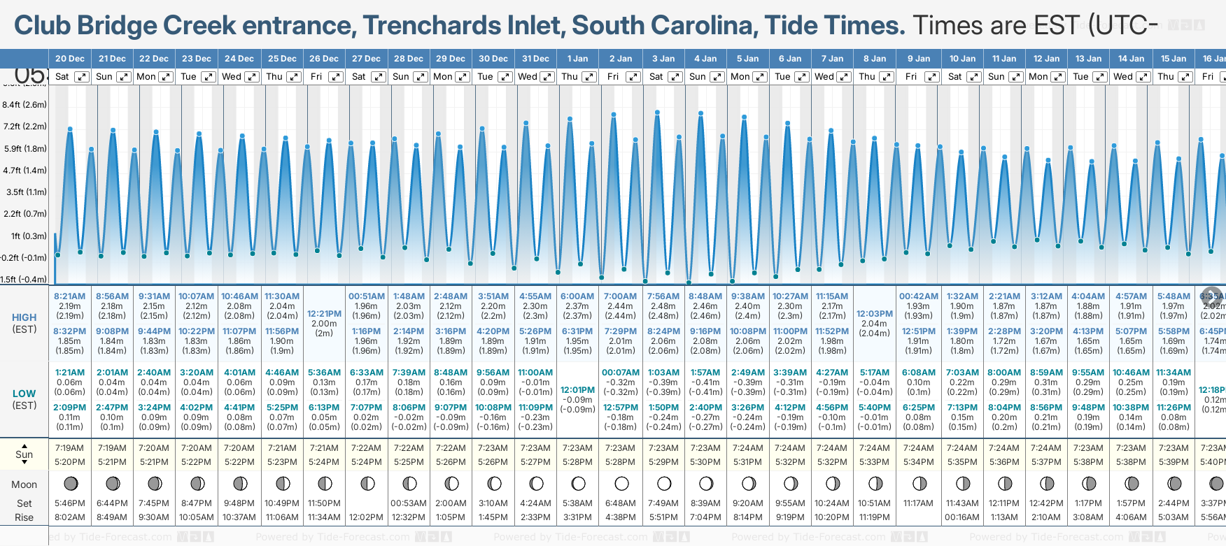 NOTE: Use of this site for Club Bridge Creek entrance, Trenchards Inlet, South Carolina tide times is subject to our terms.