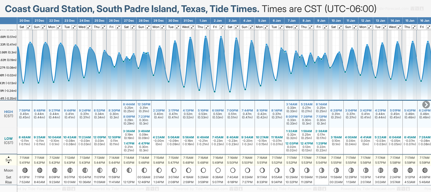 Tide chart for Coast Guard Station, South Padre IslandShowing low and high tide times for the next 30 days at Coast Guard Station, South Padre Island. Tide Times are CST (UTC -6.0hrs).