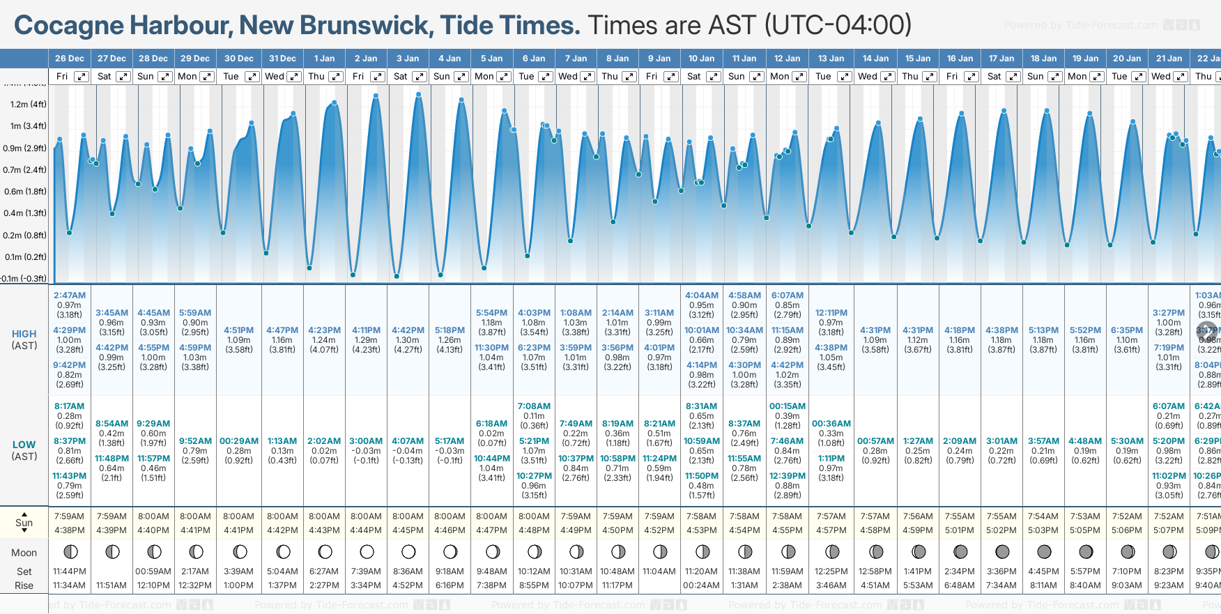 December and January Tide charts for Cocagne Harbour: The tide charts below show the height, time and date of high and low tides for the next 30 days.