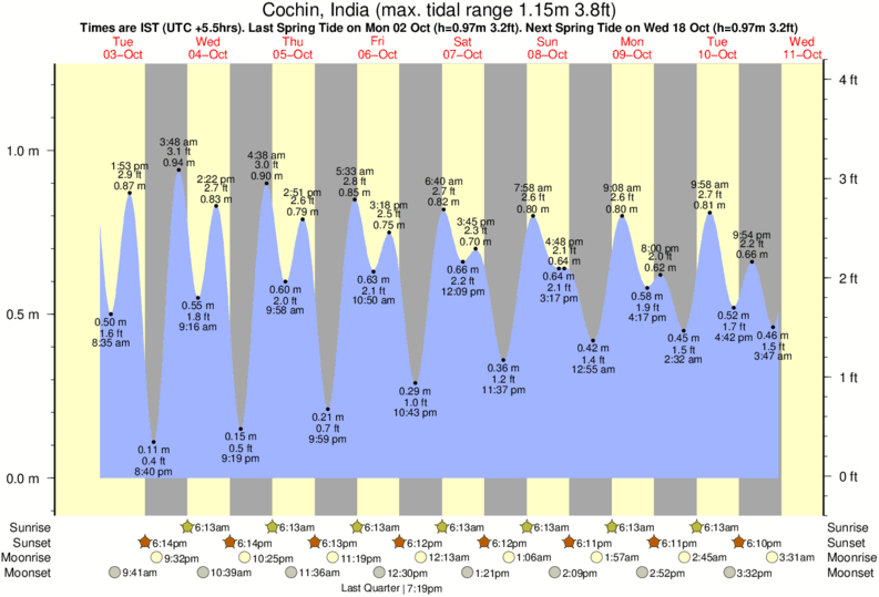 Tide Times are IST (UTC +5.5hrs). Last Spring High Tide at Cochin was on Sun 07 Dec (height: 1.14m 3.7ft). Next high Spring Tide at Cochin will be on Tue 23 Dec (height: 1.10m 3.6ft).