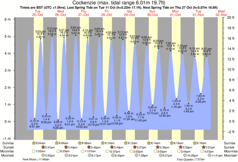 December and January Tide charts for Cockenzie: The tide charts below show the height, time and date of high and low tides for the next 30 days.