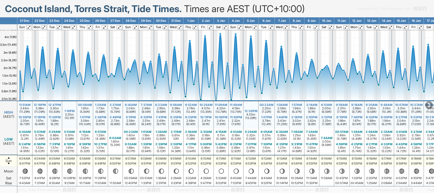 Tide Times are AEST (UTC +10.0hrs). Last Spring High Tide at Coconut Island was on Fri 19 Dec (height: 3.48m 11.4ft). Next high Spring Tide at Coconut Island will be on Sat 03 Jan (height: 4.20m 13.8ft).