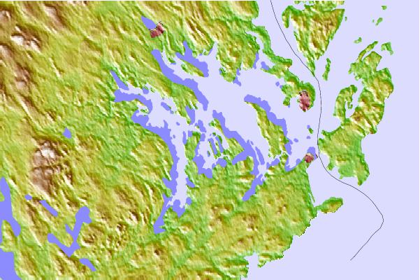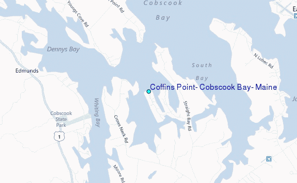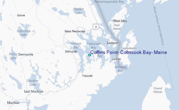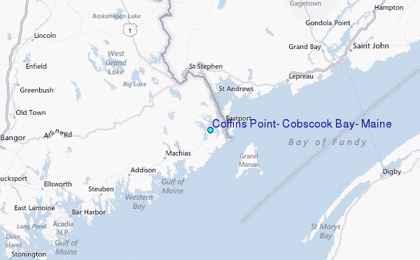 Use this relief map to navigate to tide stations, surf breaks and cities that are in the area of Coffins Point, Cobscook Bay, Maine.