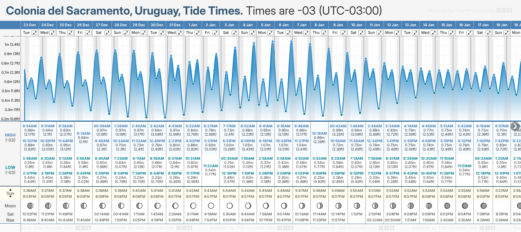 Tide chart for ColoniaShowing low and high tide times for the next 30 days at Colonia. Tide Times are -03 (UTC -3.0hrs).