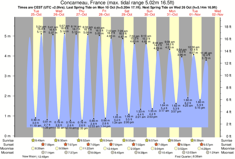 December and January Tide charts for Concarneau: The tide charts below show the height, time and date of high and low tides for the next 30 days.