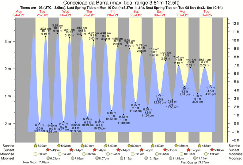 Tide Times are -03 (UTC -3.0hrs). Last Spring High Tide at Conceicao da Barra was on Fri 05 Dec (height: 3.24m 10.6ft). Next high Spring Tide at Conceicao da Barra will be on Sun 21 Dec (height: 2.92m 9.6ft).