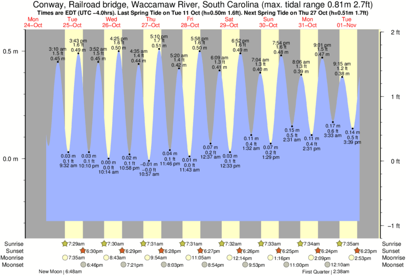 Tide Times are EST (UTC -5.0hrs). Last Spring High Tide at Conway, Railroad bridge, Waccamaw River was on Sat 20 Dec (height: 0.42m 1.4ft). Next high Spring Tide at Conway, Railroad bridge, Waccamaw River will be on Fri 02 Jan (height: 0.48m 1.6ft).