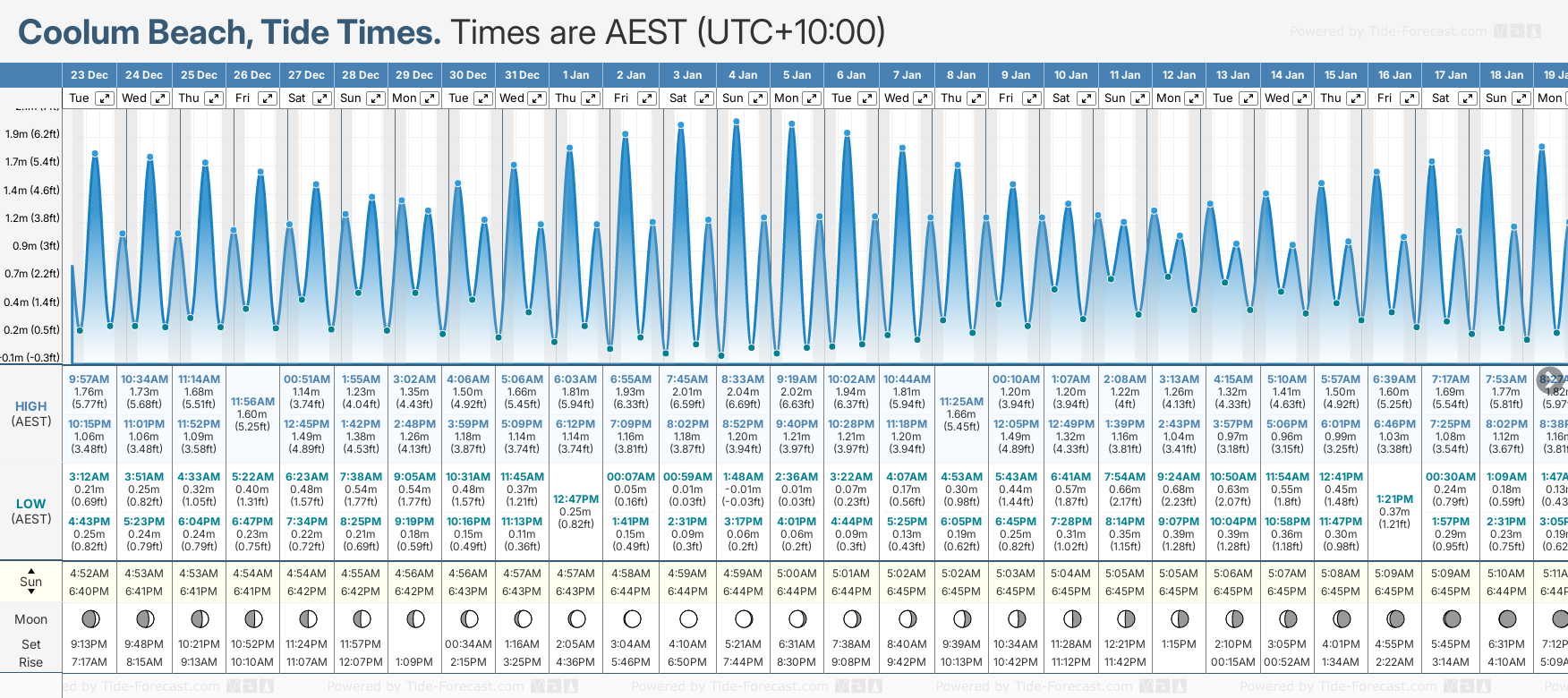 December and January Tide charts for Coolum Beach: The tide charts below show the height, time and date of high and low tides for the next 30 days.