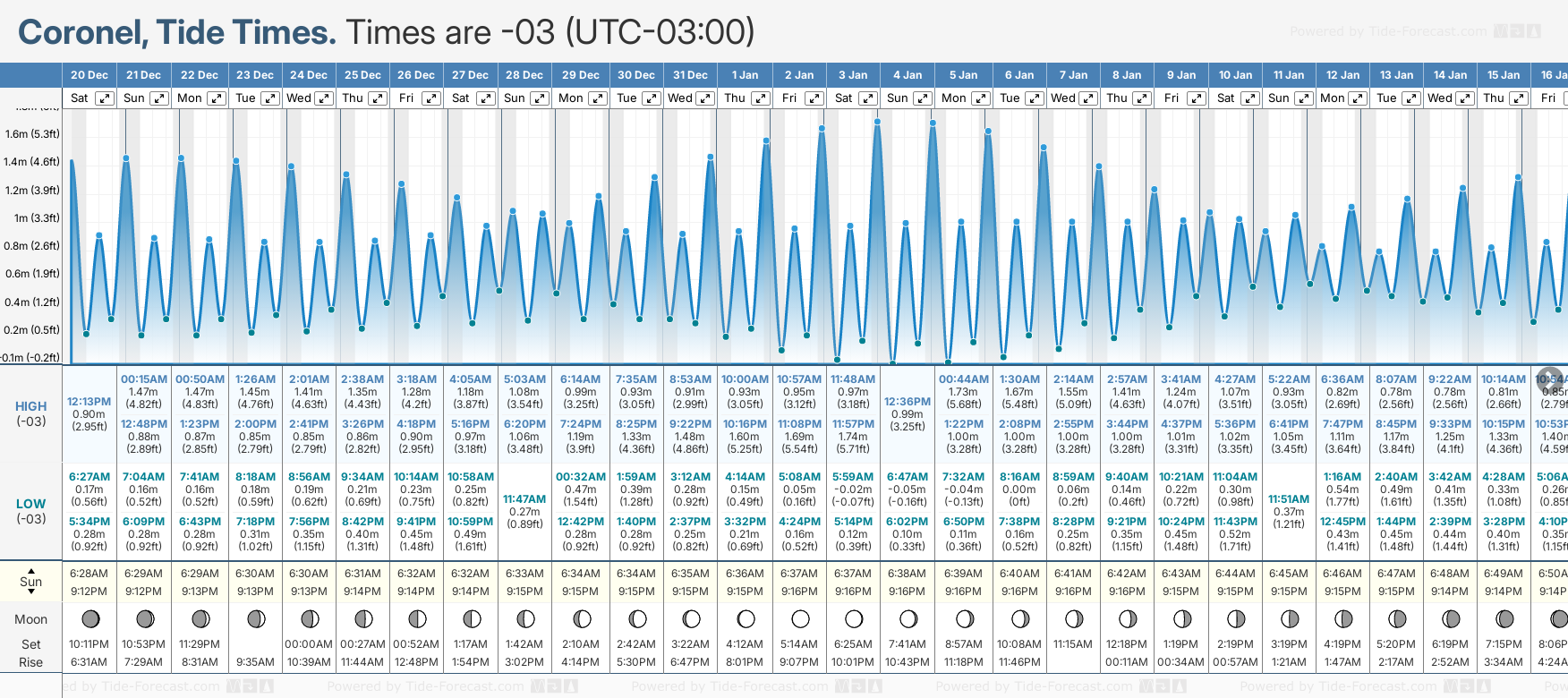 December and January Tide charts for Coronel: The tide charts below show the height, time and date of high and low tides for the next 30 days.