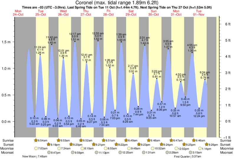 Tide Times are -04 (UTC -3.0hrs). Last Spring High Tide at Coronel was on Fri 05 Dec (height: 1.74m 5.7ft). Next high Spring Tide at Coronel will be on Sat 20 Dec (height: 1.47m 4.8ft).