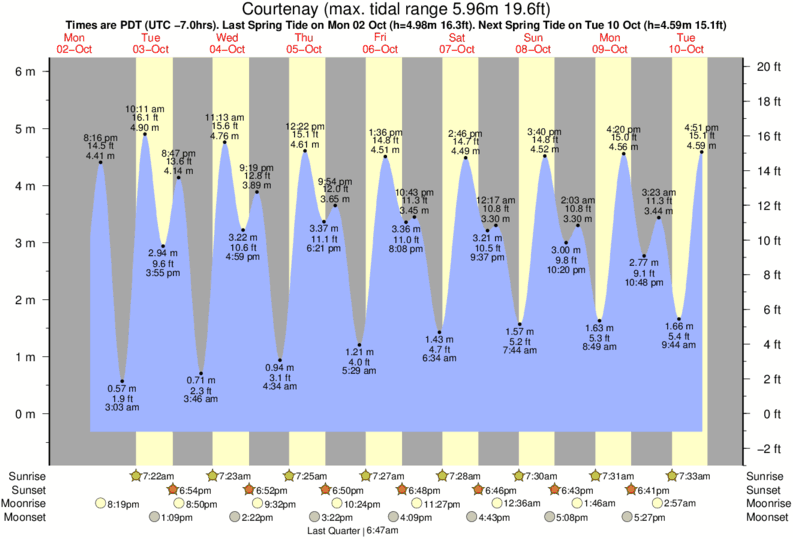 Tide Times are PST (UTC -8.0hrs). Last Spring High Tide at Courtenay was on Fri 05 Dec (height: 5.75m 18.9ft). Next high Spring Tide at Courtenay will be on Mon 22 Dec (height: 5.17m 17.0ft).