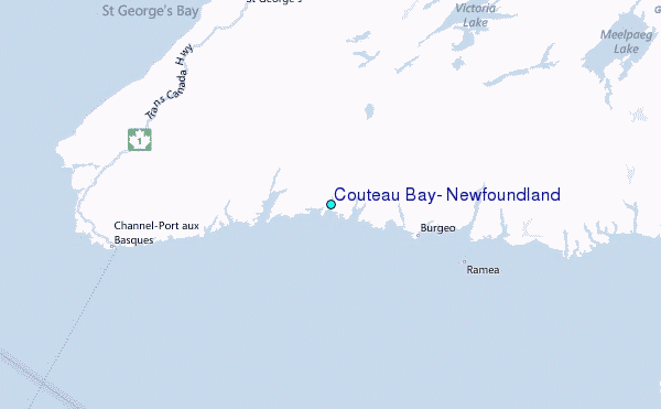 Use this relief map to navigate to tide stations, surf breaks and cities that are in the area of Couteau Bay, Newfoundland.